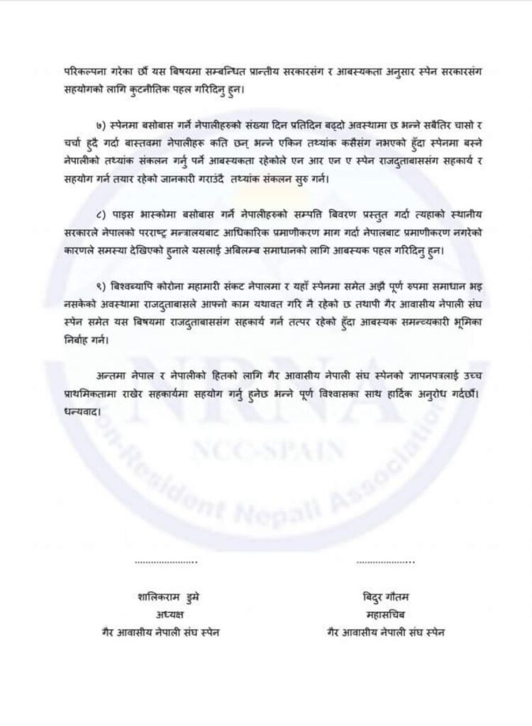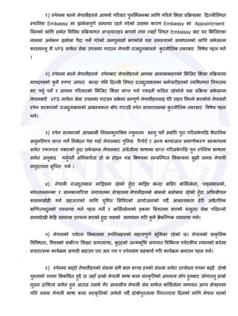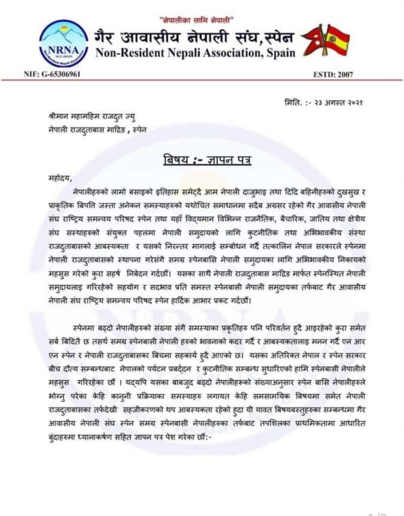 सोहि अवसरमा अध्यक्ष शालिकराम डुम्रेले एनआरएनका बिगतका कार्यसमितीहरुले जस्तै आफुहरुले पनि दुतावाससँग सहकार्य गरेर अघि बढ्ने बताउदै स्पेन स्थित नेपालीका समस्याहरु समेटेर दुतावासलाई ज्ञापन पत्र बुझाएको छ ।
