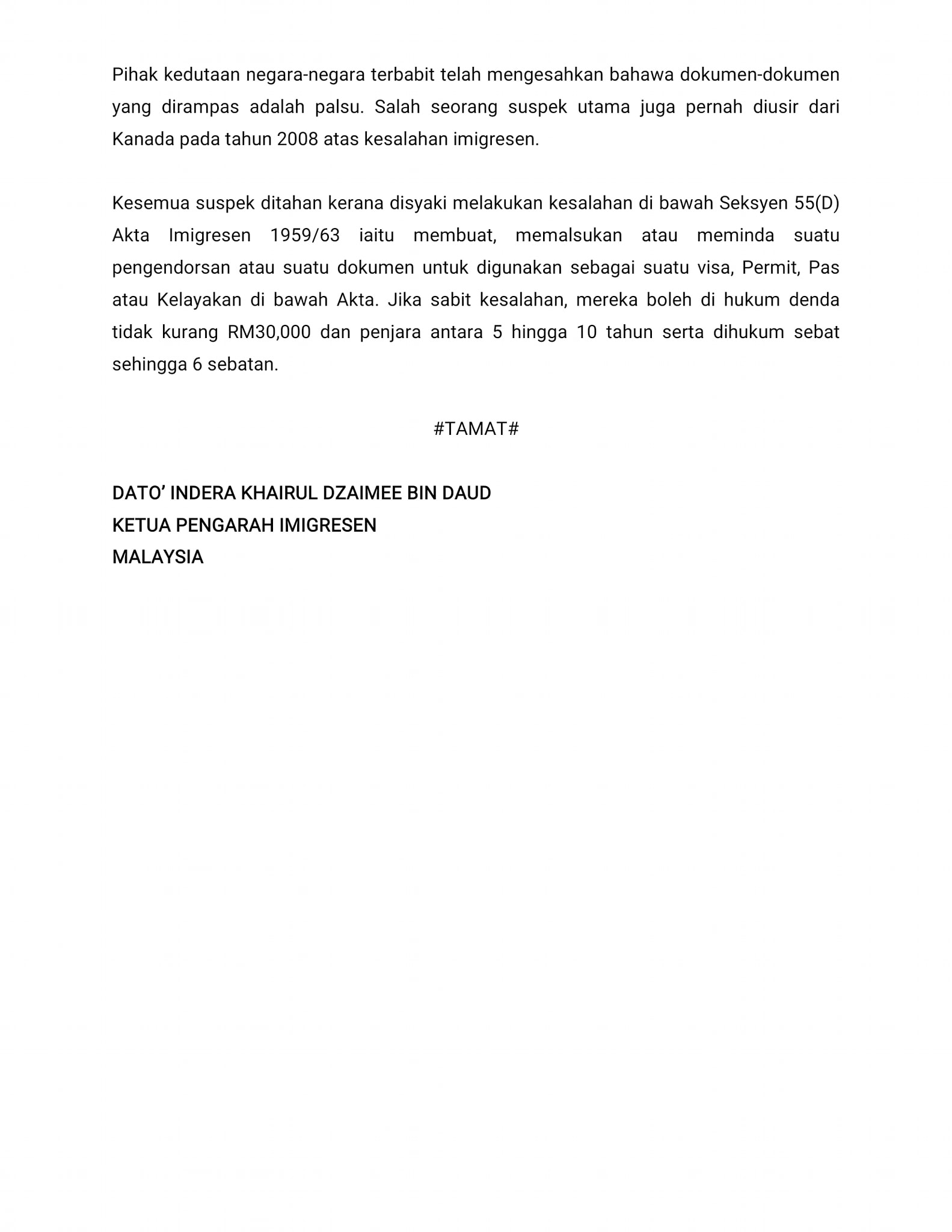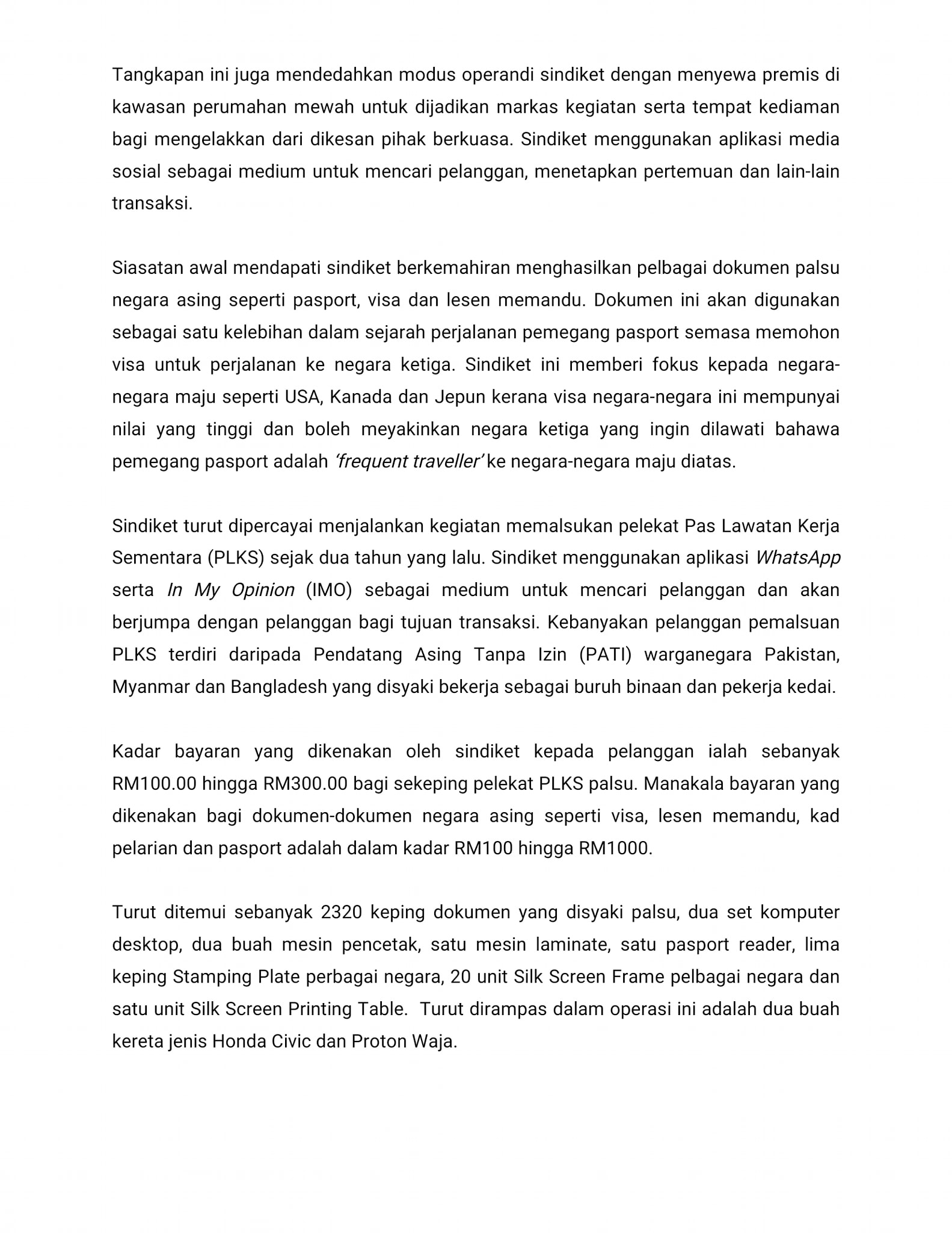 मलेसियाको अध्यागमनको विशेष दस्ताले सेतापार्क,क्वालालम्पुर,सेरी काम्वानाग,सेलागर क्षेत्रमा अपरेशन गर्दा उनीहरु पक्राउ परेका हुन । पक्राउ परेका उनीहरु संग २३२० वटा नक्कली स्टिकरहरु रहेका थिए यसैगरी डेक्सटप कम्प्युटर,प्रिन्टर,ल्यामिनेशन मेशिन,पासपोर्ट रिर्डर र विभिन्न देशको स्टाम्प सहित दुई होण्डा सिभिक गाडि र प्रोटोन वाजा कारहरु पनि वरामत गरेको जनाएको छ ।
