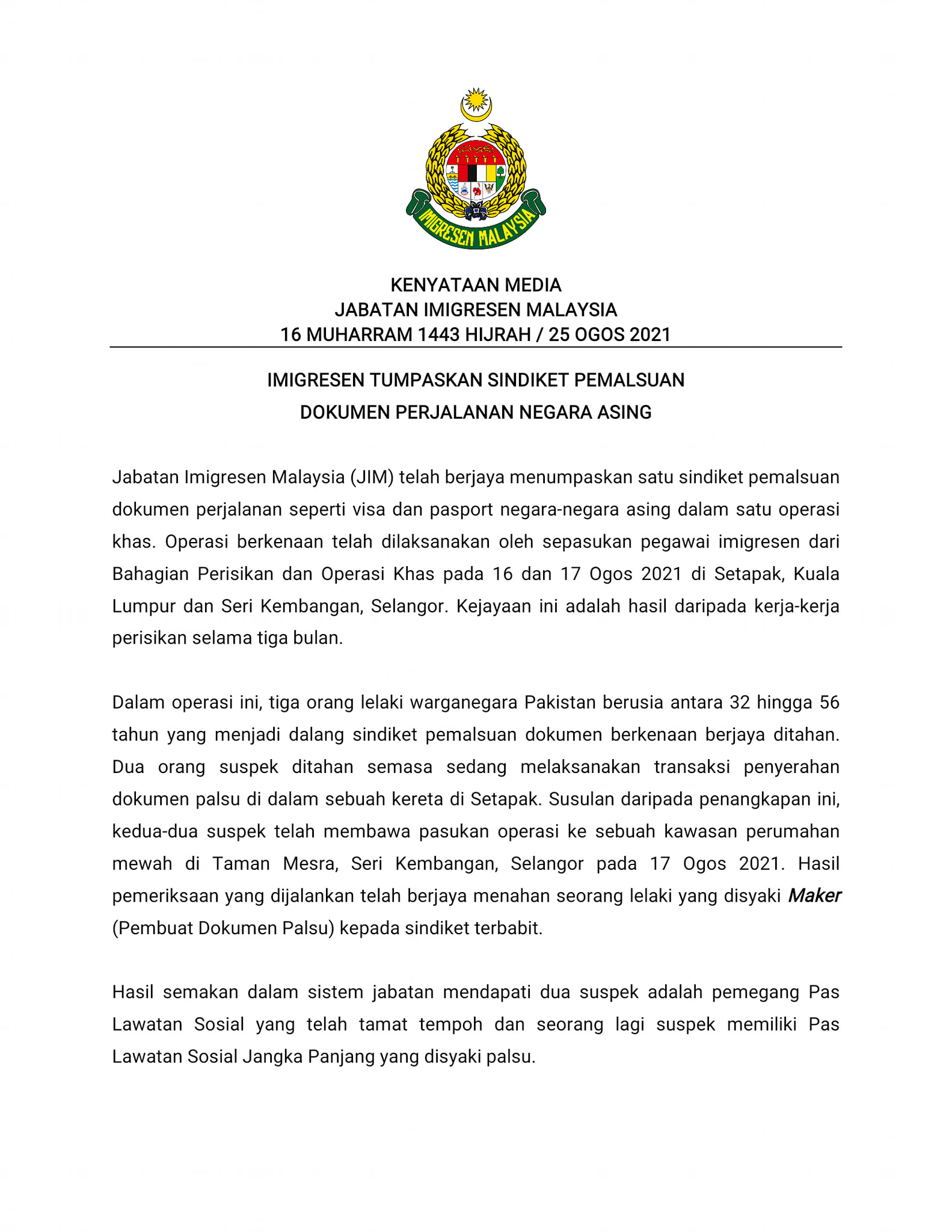 मलेसियामा नक्कली भिषा लगायतका काजजात वनाउने तीन जना पक्राउ परेका छन । पक्राउ पर्ने तीनैजना पाकिस्तानी नागरीक भएको मलेसियावाट प्रकाशित समाचाहरुमा उल्लेख गरिएको छ।