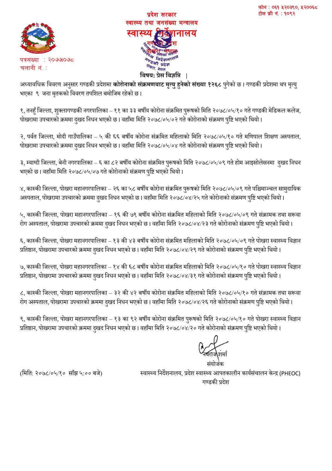 प्रदेश स्वास्थ्य निर्देशनालय पोखराका अनुसार आज मृत्यु पुष्टि हुनेमा तनहुँका एक जना, पर्वतका एक जना, म्याग्दीका एक जना र कास्कीका छ जना रहेका छन ।