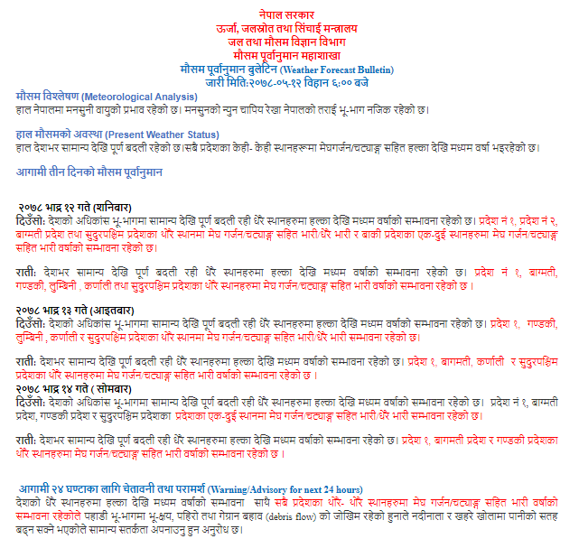 मनसुन शुरु भएयता (गत जेठ ३१ पछि) मुलुकभर मनसुनजन्य घटनामा ८५ जनाको मृत्यु भएको छ । उक्त घटनामा परी अन्य ४४ जना हराइरहेका गृह मन्त्रालयले जनाएको छ । अहिलेसम्म पाँच हजार ५०० भन्दा बढीलाई उद्धार गरी सुरक्षित ठाउँमा स्थानान्तरण गरिएको गृह मन्त्रालयका विपद् व्यवस्थापन महाशाखा प्रमुख होमकला पाण्डेले जानकारी दिनुभयो ।