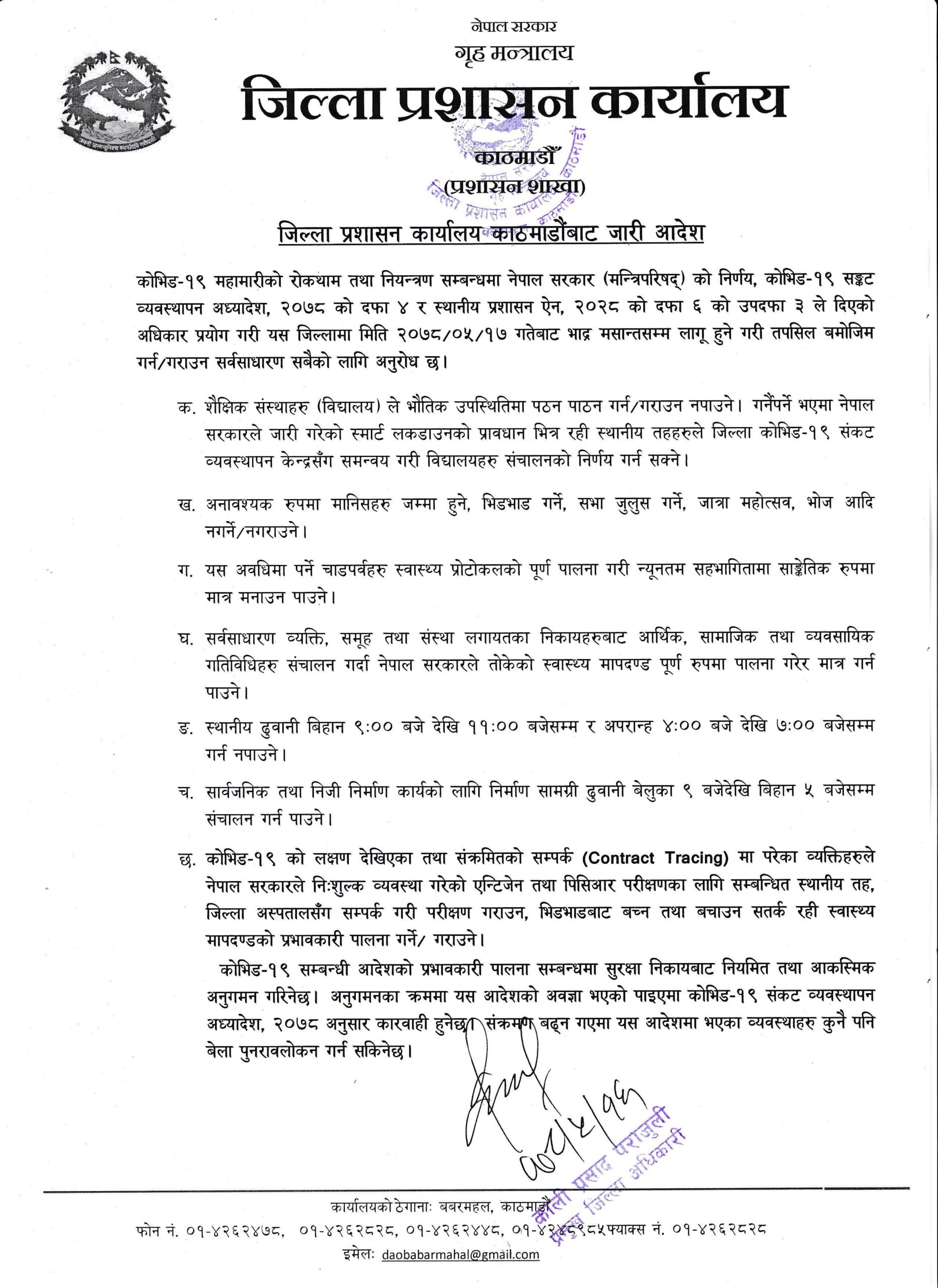 बैठक पछि काठमाडौँ जिल्ला प्रशासनले जारी गरेको आदेशमा भदौ १७ देखि भदौ मसान्तसम्म लागु हुने गरी शैक्षिक संस्थाहरू भौतिक उपस्थितिमा पठनपाठन गर्न गराउन नपाउने उल्लेख छ।