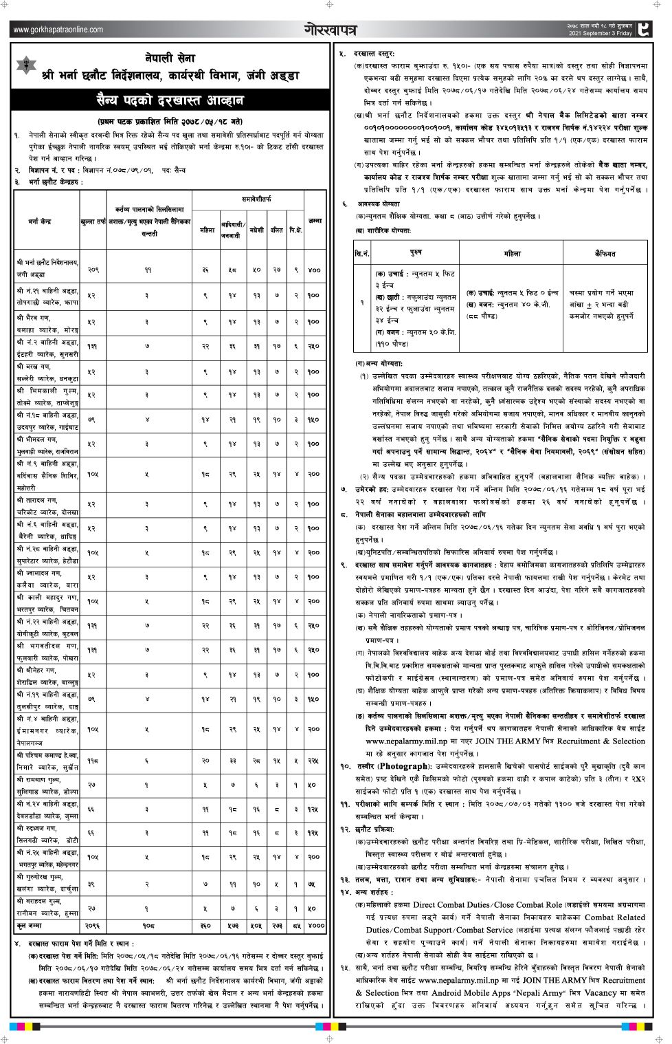बहालवाला सैनिक व्यक्ति बाहेक सैन्य पदका उम्मेदवारहरूको हकमा अविवाहित हुनुपर्ने दरखास्त आह्वानमा भनिएको छ । दरखास्त पेस गर्ने अन्तिम मिति असोज १६ गतेसम्म १८ वर्ष पूरा भई २२ वर्ष ननाघेको र बहालवाला फलोवर्सको हकमा २६ वर्ष ननाघेको हुनुपर्ने सुचनामा उल्लेख छ ।