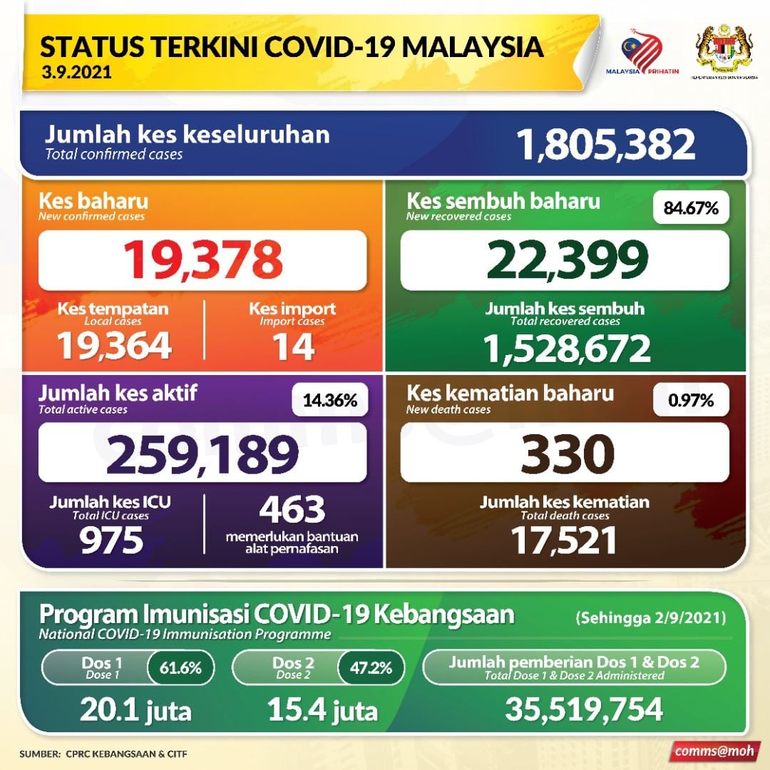 अहिले मलेसियामा २ लाख ५९ हजार १८९ सक्रिय सक्रमित छन जसमध्ये ३३५१ जनाको अवस्था गंभिर छ उनीहरुको विभिन्न अस्पतालहरुमा आईसियुमा उपचार भैरहेको छ ।