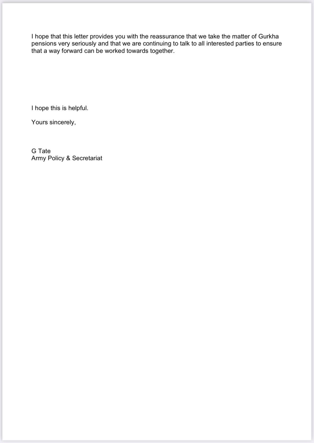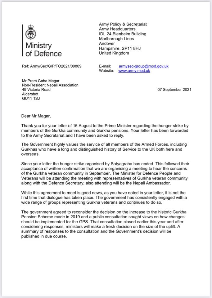 ब्रिटिश रक्षा मन्त्रालयले सेप्टेम्बर ७ मा सोही पत्रको जवाफ लेख्दै माग बमोजिम पेन्सन लगायतका सुविधा पुनराबलोकन गर्न सरकार तयार रहको जनाएको हो ।