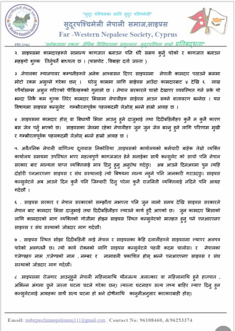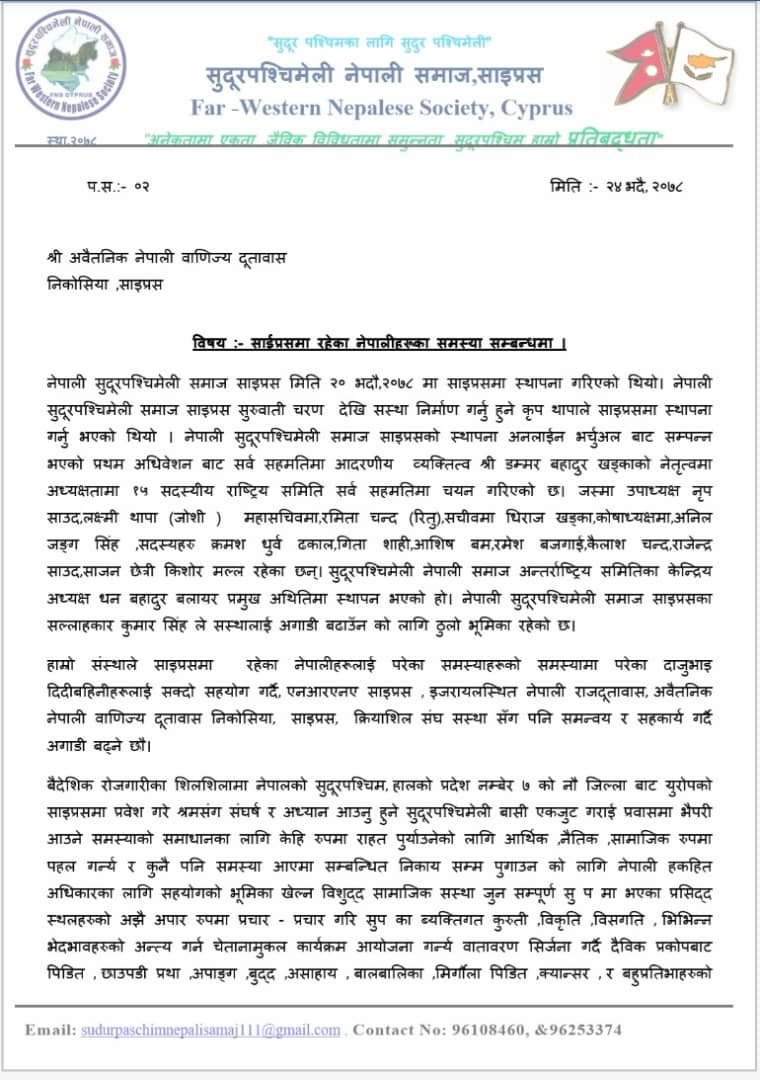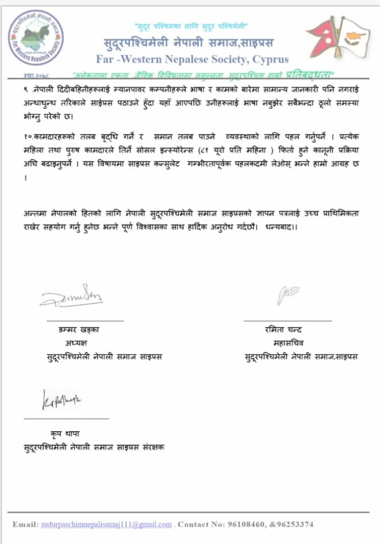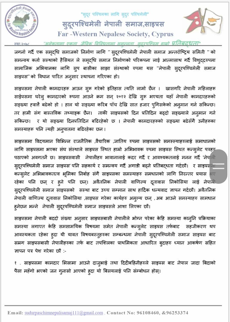 साइप्रसमा नेपालीहरुले भोग्न परेका कानुनि प्रक्रिया ,साईप्रसमा खेप्दै आएका सयौं नेपाली हरुका समस्यामा लगायतका विषय हरुलाई समेटेर सुदुरपश्चिमेली नेपाली समाज साइप्रसका अध्यक्ष डम्बर बहादुर खड्का र संरक्षक कृप थापाको नेतृत्वमा बिहिबार अबैतनिक नेपाली वाणिज्य दुतावास साईप्रसको कार्यलयमा पुगि ध्यानाकर्षण सहित ज्ञापनपत्र बुझाएको छ।