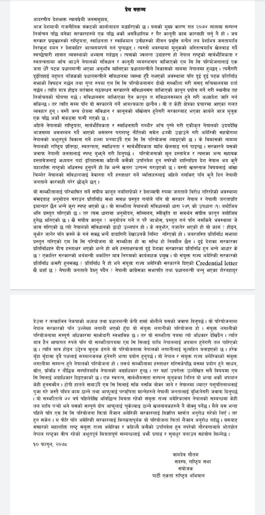मंगलबार एक विज्ञप्ति जारी गरी उनले एमसीसी सम्झौताका कारण अमेरिका र नेपालबीचको सम्झौता तलमाथि पर्न सक्ने भन्दै फिर्ता लैजान आग्रह गरेका छन् ।