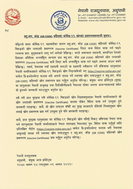 नेपाली दुतावास युएईले ले सवै नेपालीलाई कोभिड–१९ खोपको प्रमाणपत्र बोकेर मात्र यात्रा गर्ने अनुरोध गरेको छ।