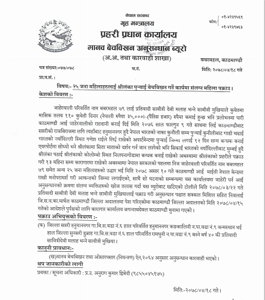 ब्युरोका अनुसार मुखियाले विभिन्न जिल्लाबाट महिलाहरूलाई काठमाडौं ल्याउने र उनीहरूको राहदानी बनाइदिने र विभिन्न नाकाबाट भारतको नयाँदिल्ली पुर्याएर एजेन्टको जिम्मा लगाउने गरेकी थिइन् ।