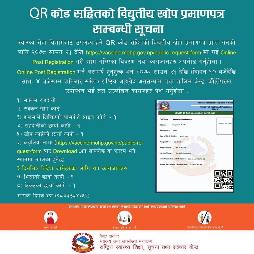 त्यसका लागि https://vaccine.mohp.gov.np/public-request-form मा गई अनलाइन पोष्ट रजिष्ट्रेशन गर्न सकिन्छ।