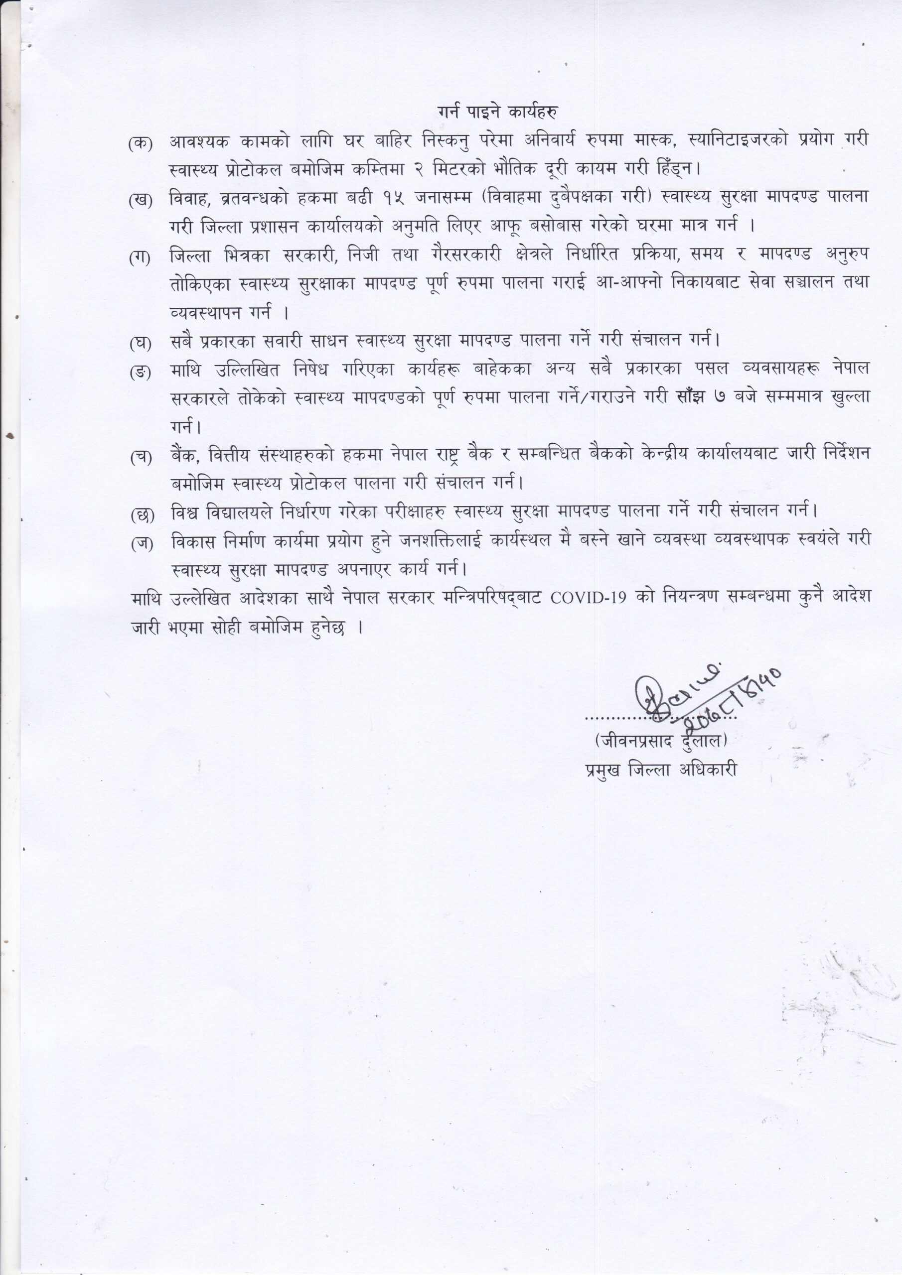 लकडाउनको समयमा नेपाल सरकारद्वारा तोकिएको सामाजिक दूरी, स्वास्थ्य सुरक्षा मापदण्डको अनिवार्य पालना गर्ने, बजार, मेला, महोत्सव, पार्टी, भोज, भतेर लगायतका भिडभाड हुने कार्य नगर्ने नगराउने र कोभिड–१९ को लक्षण देखिएमा वा त्यस्तै प्रकारका अन्य कुनै स्वास्थ्य समस्या देखिएमा तुरुन्तै नजिकको स्वास्थ्य संस्था वा स्थानीय तहमा सम्पर्क राख्नु पर्नेछ ।