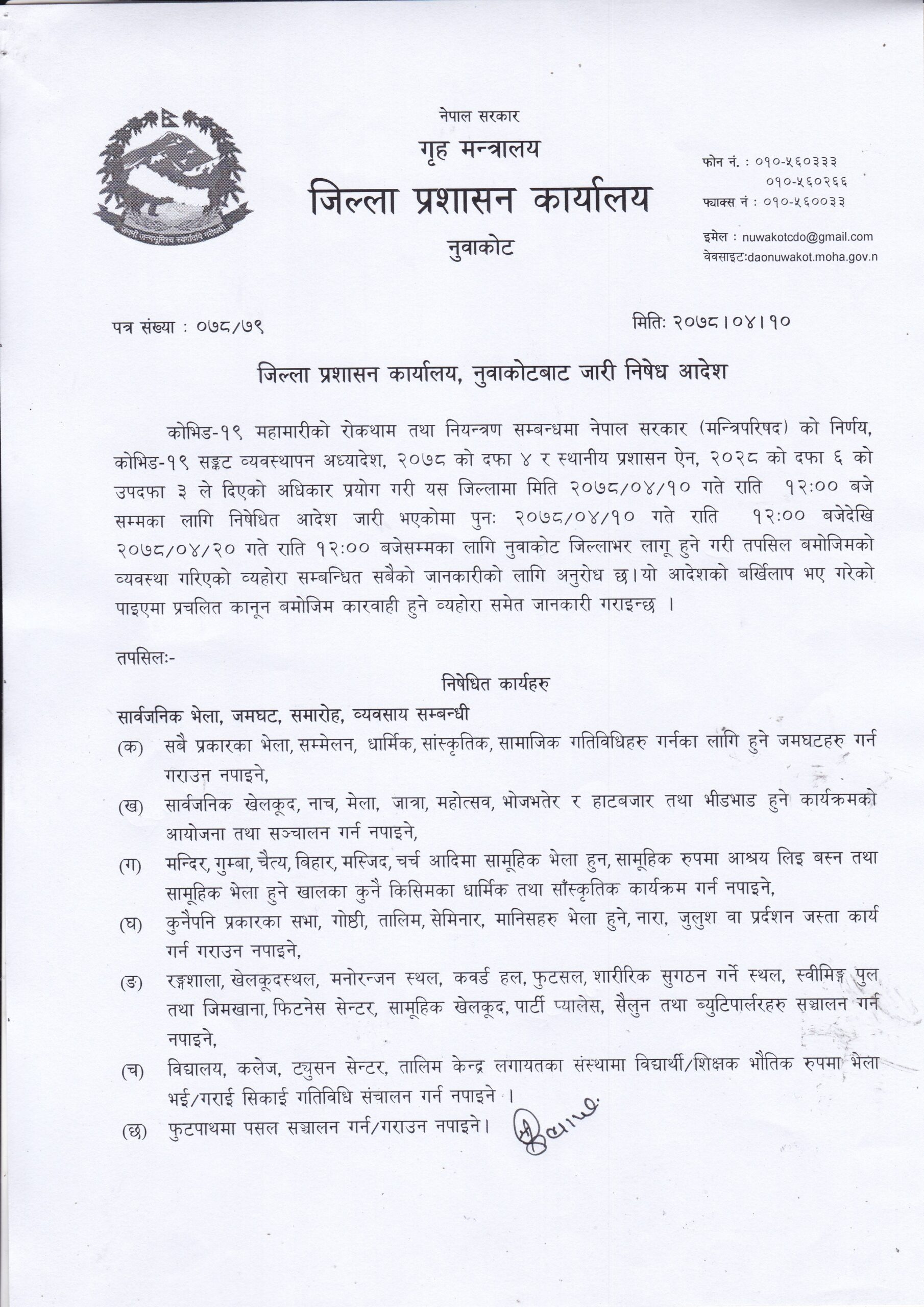 नुवाकोटमा थप १० दिन निषेधाज्ञा थपिएको छ ।