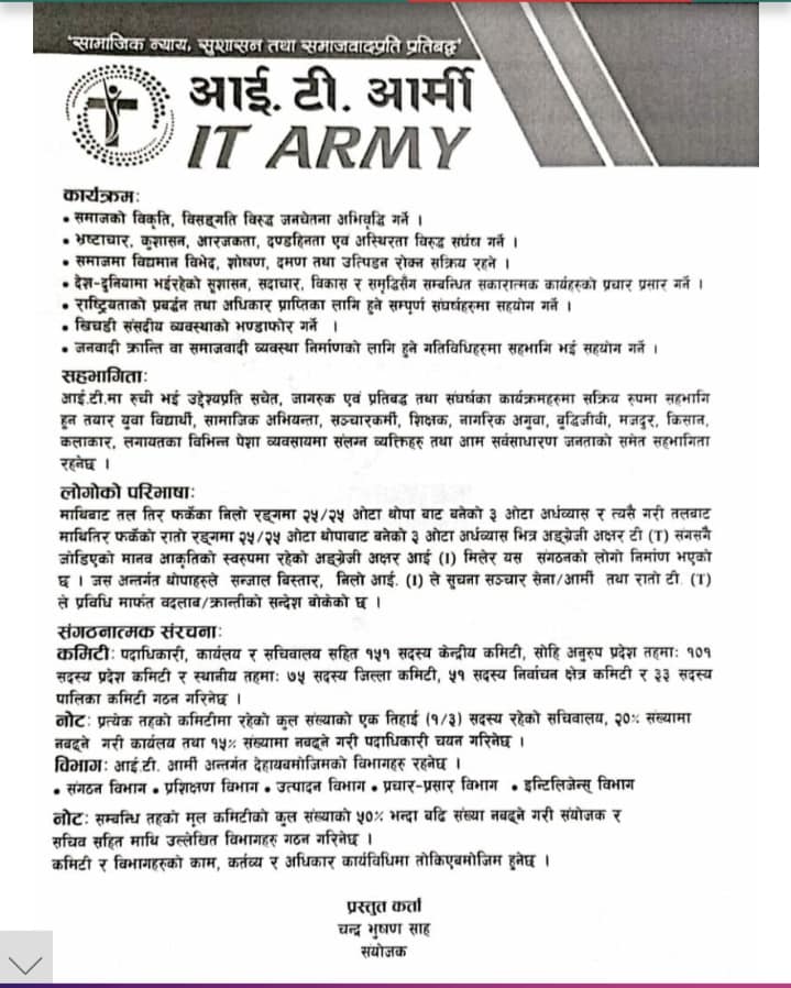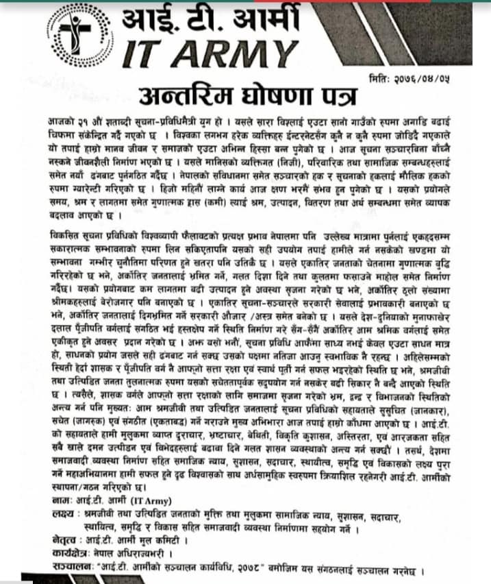 भक्तपुरको लोकन्थलीस्थित एक पार्टी प्यालेसमा कार्यक्रम गरेर ‘आइटी आर्मी’ घोषणा गरिएको छ।