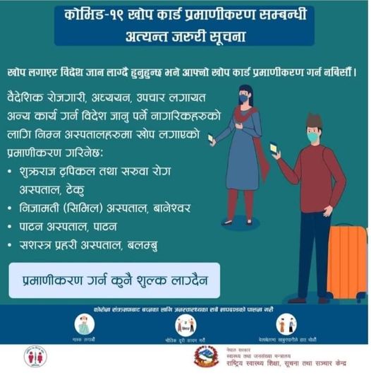 मन्त्रालयले कुनै पनि कामका लागि विदेश जान लागेका हरेक यात्रुले अस्पतालबाट कोभिड–१९ विरुद्ध लगाएको खोप प्रमाणीकरण पत्र लिएर मात्र जान सुझाएको छ। यस्तो पत्रको कुनै शुल्कसमेत नलाग्ने मन्त्रालयले स्पष्ट पारेको छ।