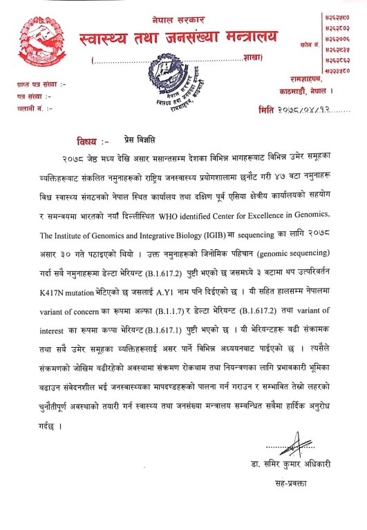 भेटिएका भेरिएन्ट र म्युटेन्टहरु बढी संक्रामक तथा सबै उमेर समूहका व्यक्तिलाई असर पार्ने देखिएको समेत मन्त्रालयले जनाएको छ ।
