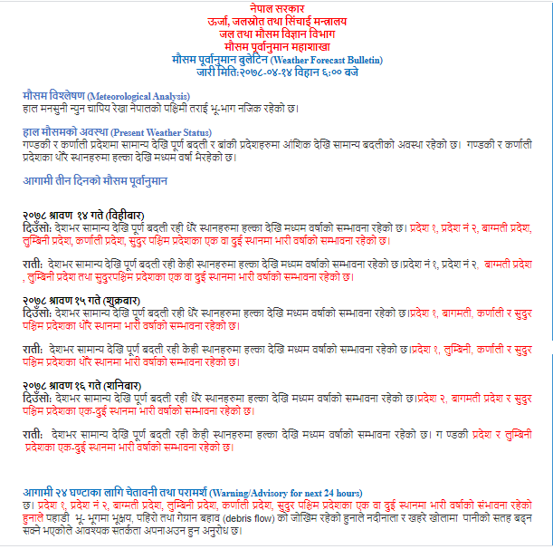 मौसमविद्ले प्रदेश-१, प्रदेश-२, वाग्मती, लुम्बिनी र सुदूरपश्चिम प्रदेशका केही ठाउँमा बाढी पहिरोको जोखिम रहेकाले सावधानी अपनाउन आग्रह गरेका छन् ।