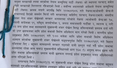 लुम्बिनी प्रदेशका मुख्यमन्त्री शंकर पोखरेल ३४ जना सांसदले प्रदेशसभामा अविश्वास प्रस्ताव दर्ता गरेका छन् ।