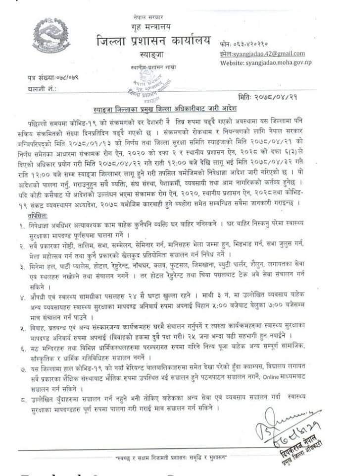 कोरोना सक्रमितहरु वढदै जान थालेपछि स्याङ्गजा जिल्लामा प्रशासनले निधेषाज्ञाको अवधि एक हप्ता थपेको छ ।