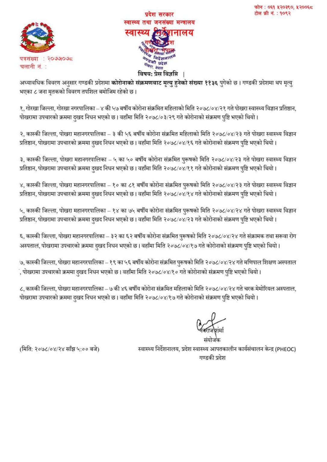 आज थपिएकासंगै गण्डकीमा कोरोना संक्रमितको कूल संख्या ७२ हजार ५१ पुगेको छ ।