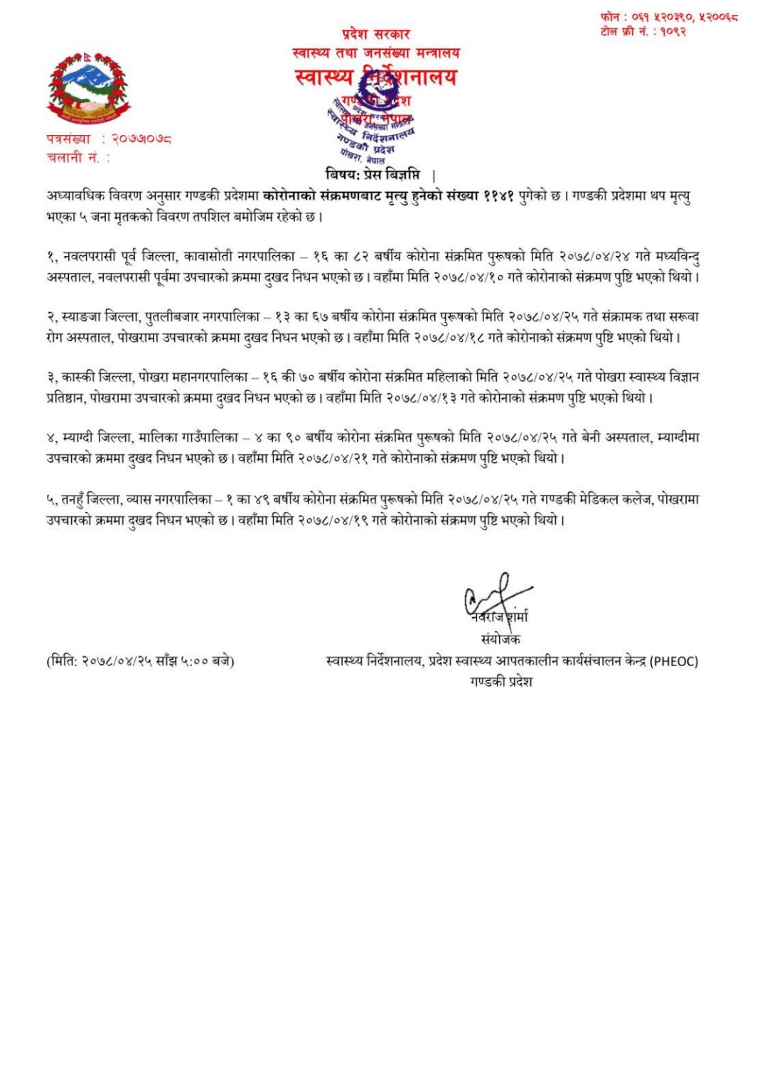 आज मात्रै गण्डकि प्रदेशमा नवलपरासी पुर्वका एक जना,कास्किका एक जना म्याग्दिका एक जना तनहँुका एक जनाको समेत मृत्यु भएको छ ।