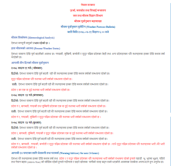 देशभर धेरै स्थानमा हल्कादेखि मध्यम वर्षा तथा प्रदेश १ र सुदूरपश्चिम प्रदेशका थोरै स्थानमा भारी बर्षाको सम्भावना रहेको हुनाले पहाडी भूभूगमा भूक्षय, पहिरो तथा गेग्रान बहावको जोखिम रहेको हुनाले नदीनाला र खहरे खोलामा पानीको सतह बढ्न सक्ने भएकाले आवश्यक सतर्कता अपनाउन हुन अनुरोध छ।